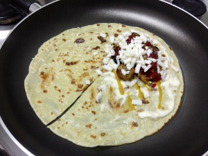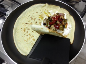 - عند تمام نضج الناحية الأخري نضيف الحشو والاضافات المختارة (مايونيز – كاتشب – موتزاريلا – مستطردة) الي الكريب قبل اخراجه من الطاسه ونقوم بلف الكريب ثم قلبه داخل الطاسة حتي تذوب الجبن الموتزاريلا.