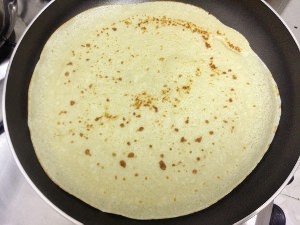- نحضر طاسة و نمسحها بنقطة زيت ونضيف قليلا من خليط الكريب في الطاسة مع تحريك الطاسة بشكل دائري بسرعة للحصول علي كريب رقيق. يلاحظ أن تكون النار هادئة.